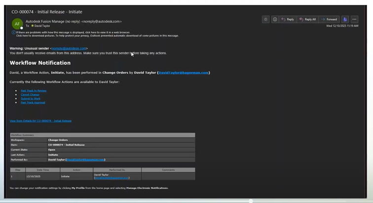 When contributors are part of a workflow—such as reviewing a change order—they receive real-time notifications via email, allowing them to quickly open tasks and approve or comment on requests.